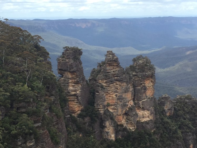 Our second stop of the day was to the Three Sisters Rock Formation in Jamison Valley. Though technically shaped by land erosion, the unusual rocks are told in Aboriginal Legend to have started as three sisters living in the valley, who were members of the Katoomba Tribe. The three sisters fell in love with three brothers from the neighbouring Nepean Tribe, yet their marriages were forbidden by tribal law. The brothers did not want to accept this prohibition though and instead captured the sisters, resulting in a battle between the two tribes. A tribal elder turned the sisters into stone to protect them, but was then killed in the fight and nobody else was able to turn them back; thus the three sisters stayed as stone forever more.