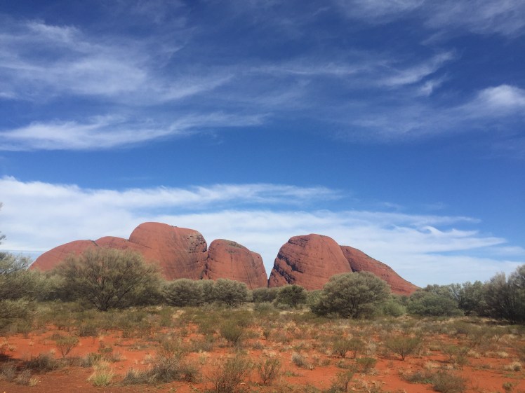 Our last stop was to Kata Tjuṯa, also known as the Olgas (as the tallest peak is called Mount Olga). These are a group of large, domed rock formations which are sacred to the aboriginal people and are believed to be about 500 million years old. Kata Tjuṯa means “many heads” in the Pitjantjatjara aboriginal language. There are a lot of legends surrounding the rocks and one tells the story of the great snake king Wanambi, who is said to live on the summit and only come down during the dry season. The tallest part of Kata Tjuṯa is higher than Uluru and they are located within the same national park, the Uluru-Kata Tjuta National Park.