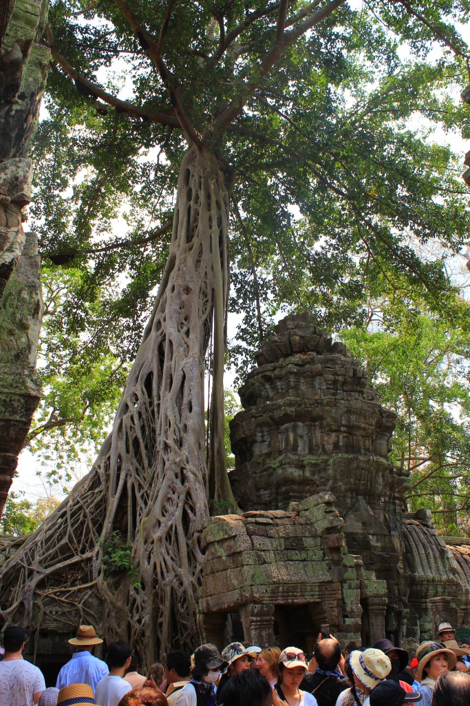 The Buddhist temple of Ta Prohm is famous for appearing in the Tomb Raider films and the temple looks as though it is being swallowed by a large tree!