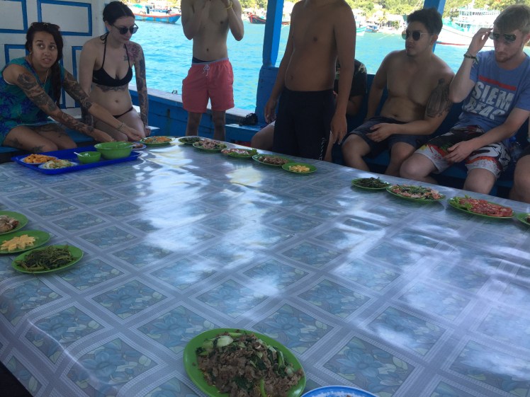 On the cruise, we ate delicious food, played cards, sunbathed, listened to music and enjoyed some snorkelling and swimming in the crystal blue waters. The organiser of the boat cruise, Funky Monkey (I have my suspicions that this wasn’t his real name…) sang us a Vietnamese song and then made us sing songs associated with each of our respective countries. We thought he would ask the Brits amongst us to sing God Save The Queen, but instead he opted for a different British classic, Wonderwall by Oasis!