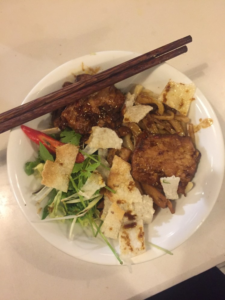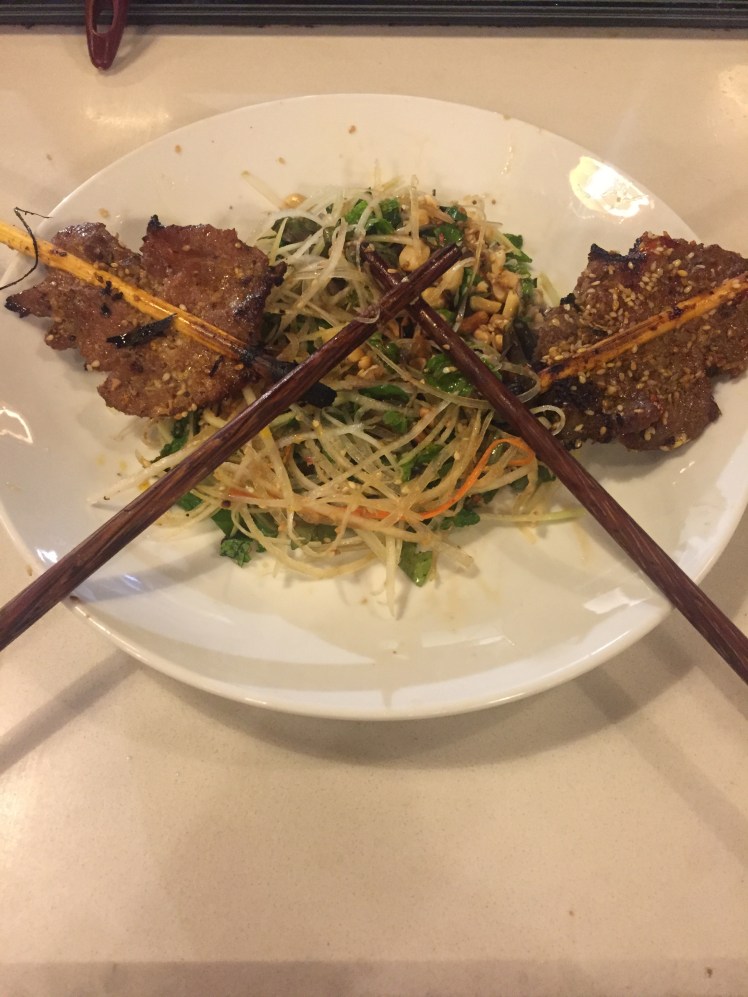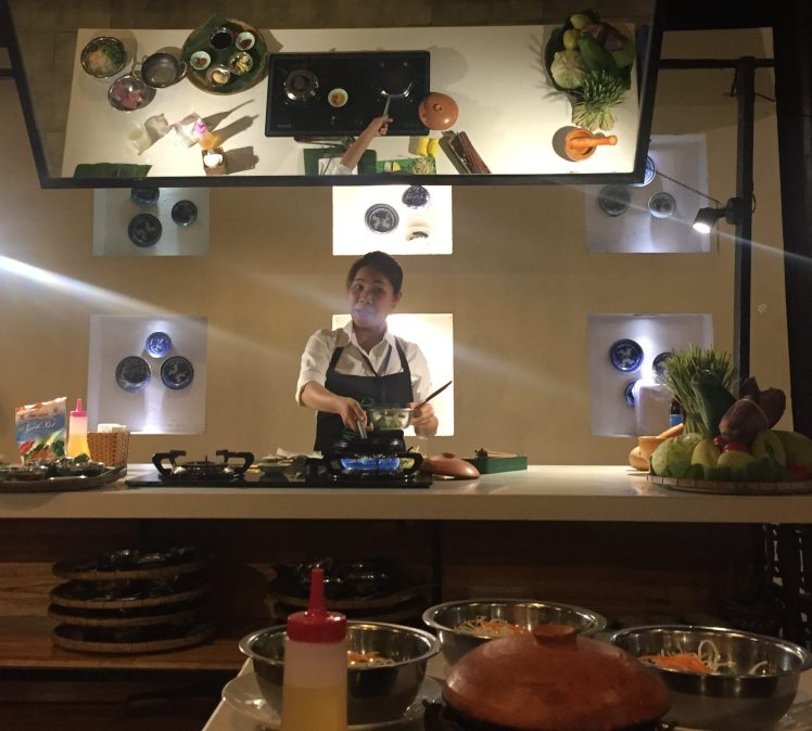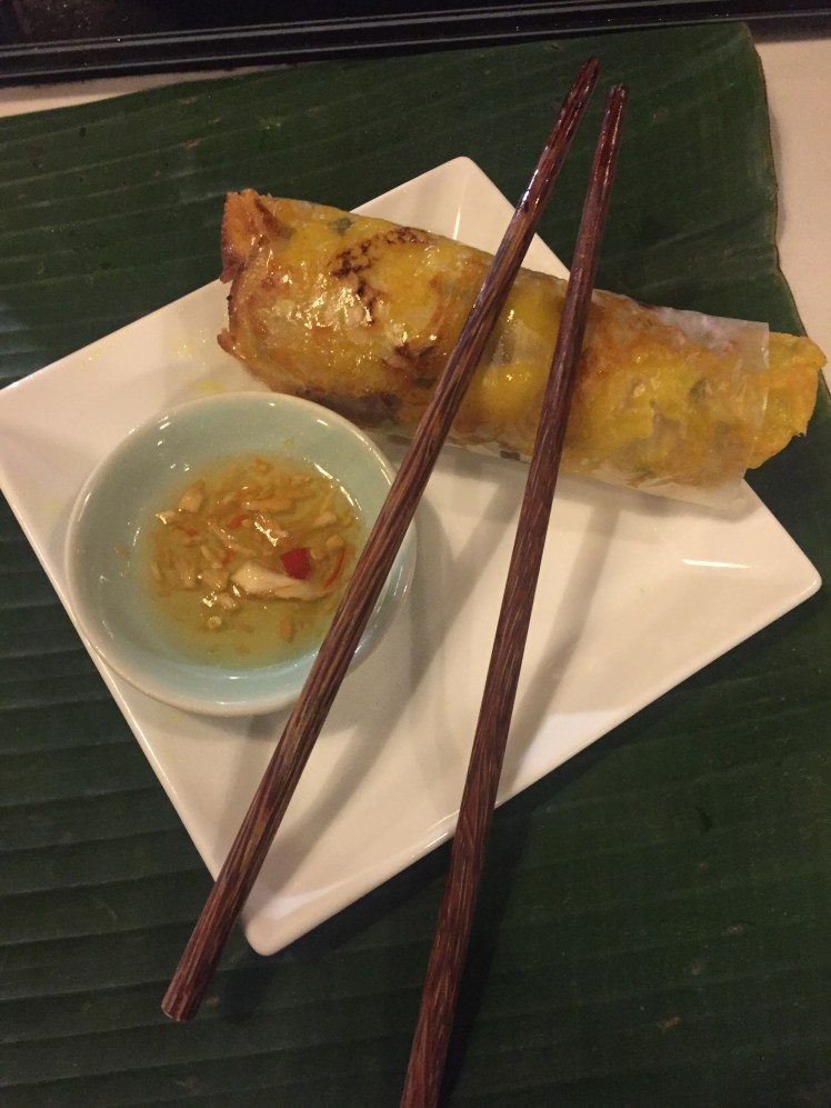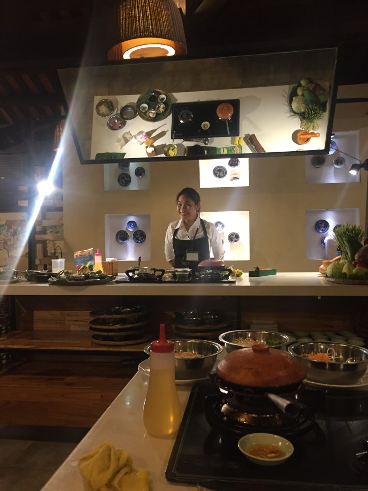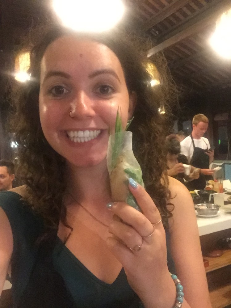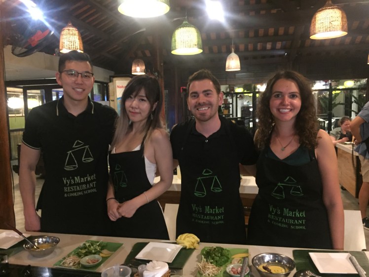 Firstly, we were shown how to make bánh xèo, which translates to mean “sizzle cake” and is a form of crispy, savoury pancake stuffed with rice. We then made spring rolls, papaya salad, skewers and cao lầu, a noodle dish that is considered to be Hội An’s speciality. Our head chef and her staff were really helpful and the class was easy to follow, despite my presentation skills not being quite up to Ms. Moon’s standard! Nonetheless, everything was delicious, and we were even given a booklet of the recipes we had made, so that we could impress our families back home with our new Vietnamese cooking skills.