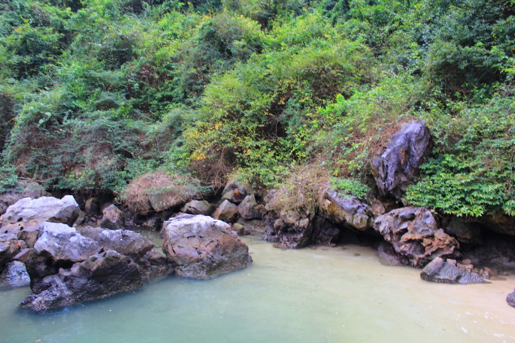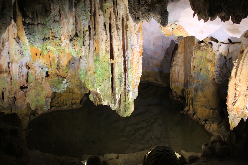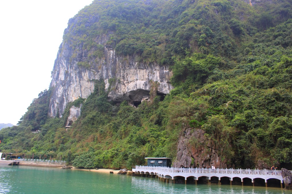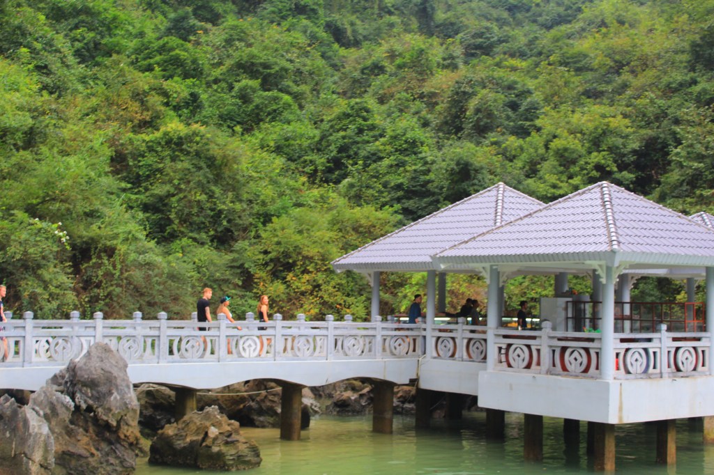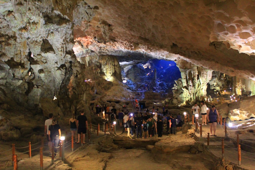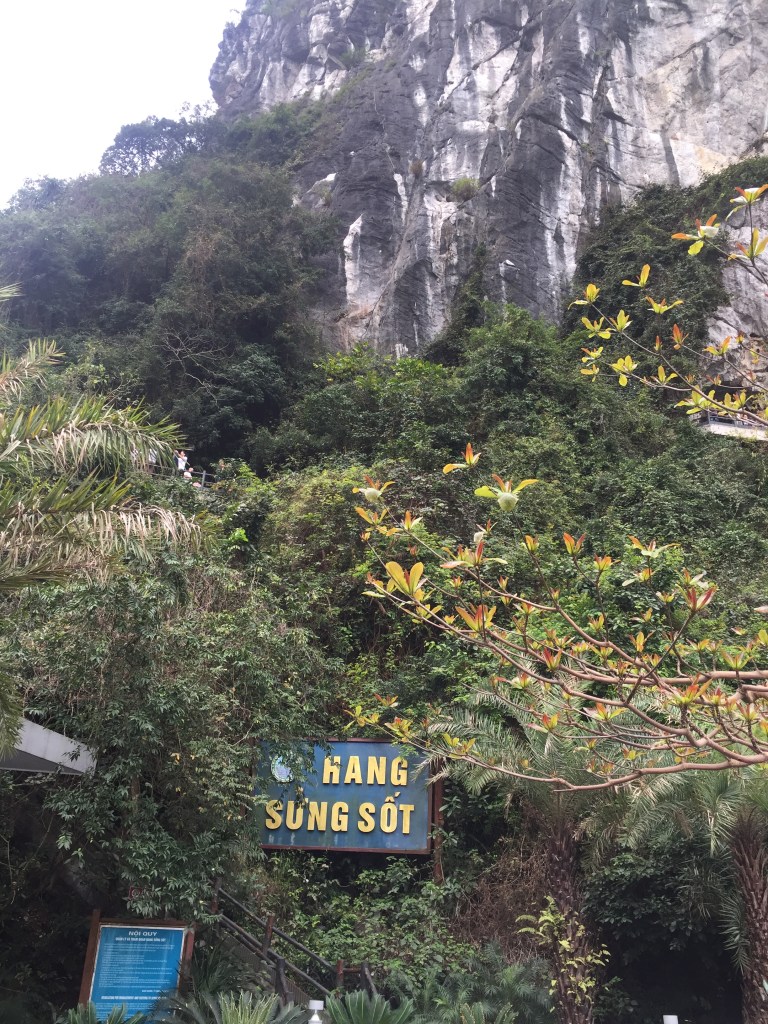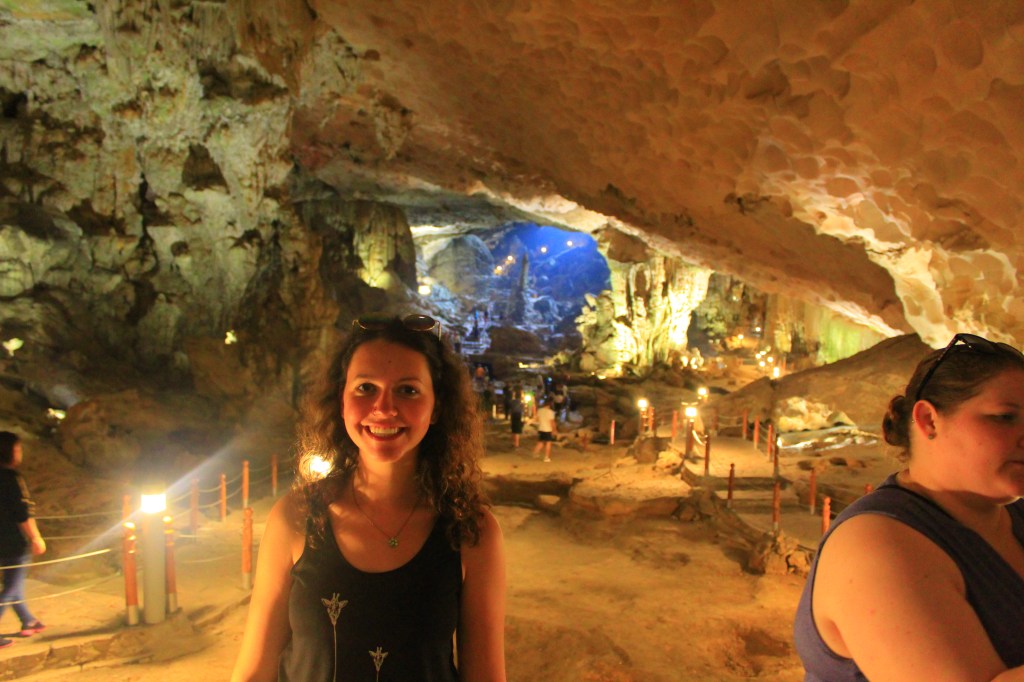 The following day, before heading back to Hanoi, we visited some large caves that surround the bay. These are a UNESCO World Heritage Site and are called the Sung Sot (or “surprise”) Caves. They are the biggest caves in Hạ Long Bay. Fishermen used to get fresh water from inside them, but they are no longer allowed as they have a protected status. The caves’ rocks feature stalactites and stalagmites and visitors used to graffiti them, though this is no longer allowed. We saw some graffiti that dated back to 1911, as well as a turtle-shaped rock and a natural heart shape. Sinh told us some really interesting information about the caves and the surrounding areas, and this was a great chance to find out about the place we had spent the night, swaying back and forth on our boat, from both the alcohol and the waters underneath us!