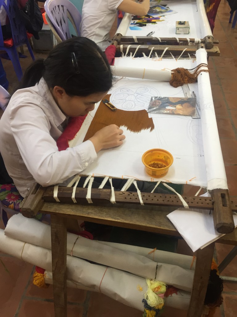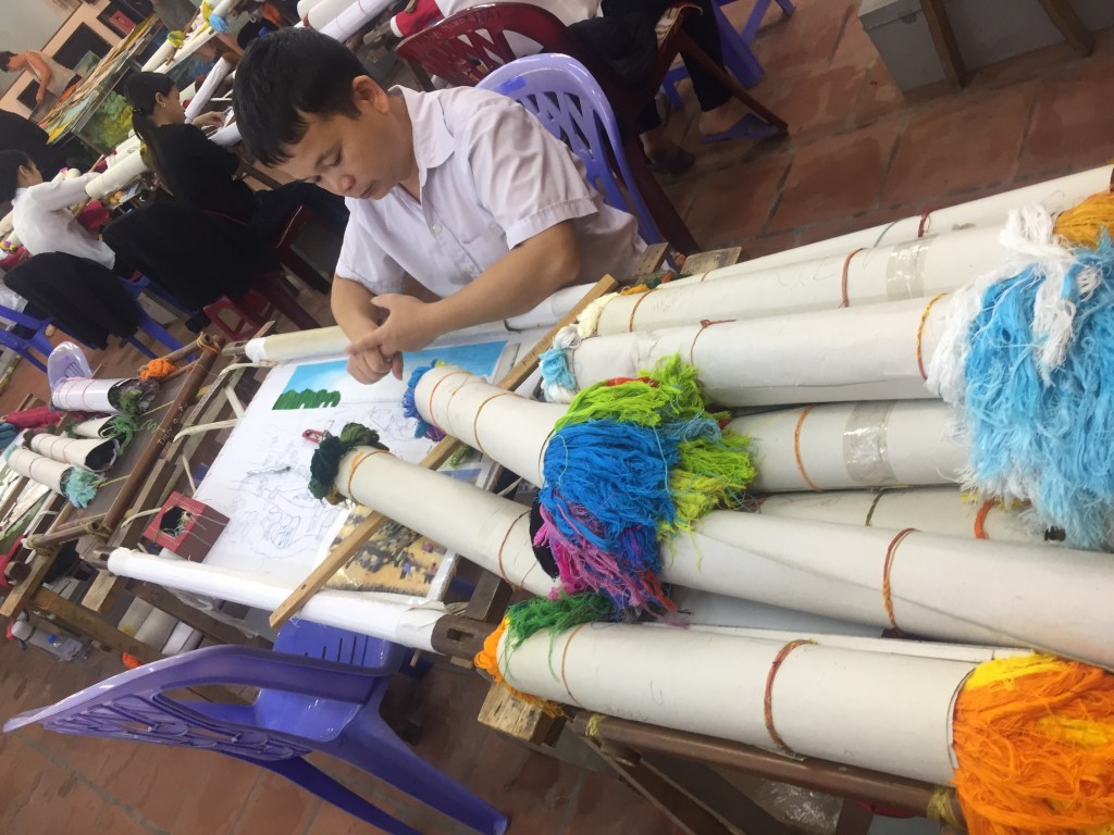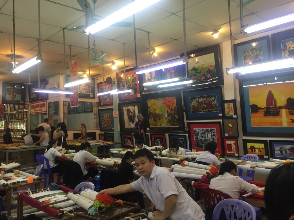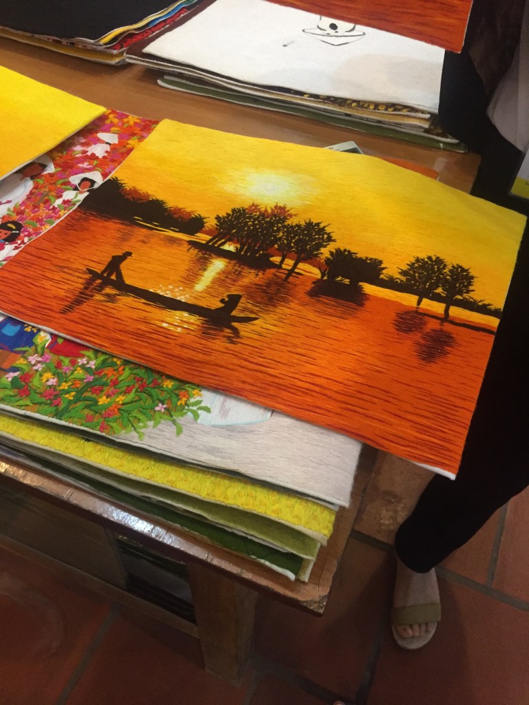 We took a four-hour drive to Hạ Long Bay and had a short break at a service stop en route, where we were shown a really wonderful centre which opened in 1996 and is a place for people with disabilities to display and sell their artwork. We saw tapestries, embroideries, sculptures, jewellery and more. The art was absolutely stunning.