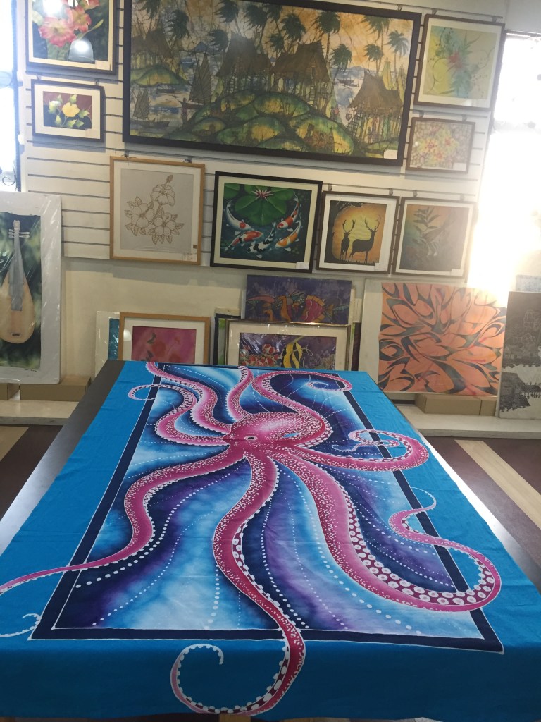 The subsequent stop was to Jadi Batek Art Gallery. Here, we could see artists creating handmade prints and browse the gallery’s selection of wares, including soaps, clothing, statues and art. Again, the intention was for tourists to buy some of the artwork. Nonetheless, it was interesting to witness the ancient batik cloth technique, where artists use wax dye to make uniquely patterned materials.